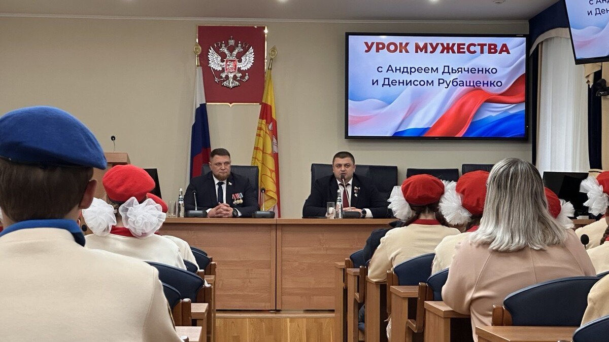 «Урок мужества» для ребят провели председатель городского парламента и Герой России Андрей Дьяченко и депутат областной Думы и участник СВО Денис Рубащенко В Воронежской городской Думе 29 января собрались юнармейцы, чтобы пообщаться с героями, узнать об их опыте и получить ценные напутствия. Перед школьниками выступили председатель городского парламента и Герой России Андрей Дьяченко и депутат областной Думы и участник СВО Денис Рубащенко. Фото: Фото: Фото: Фото: Андрей Дьяченко рассказал ребятам о своём жизненном пути и выборе профессии. Он вспомнил, как в юности самостоятельно поехал поступать в Армавирское высшее военное авиационное училище, поделился первыми шагами в авиации. — Мы рассказали о том, как выбирали профессию, какие цели ставили перед собой и как пришли к нынешней деятельности. Хотелось, чтобы ребята не боялись мечтать, ставить большие цели и осознанно выбирать своё будущее, — отметил Андрей Дьяченко. Спикер выразил надежду, что такие «Уроки мужества» будут проходить ре