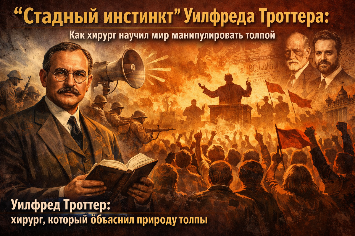 В 1916 году, в разгар Первой мировой войны, британский хирург Уилфред Троттер опубликовал книгу «Стадный инстинкт в мирное время и на войне». Эта работа стала одним из первых серьезных исследований массовой психологии и оказала глубокое влияние на ключевых мыслителей XX века.