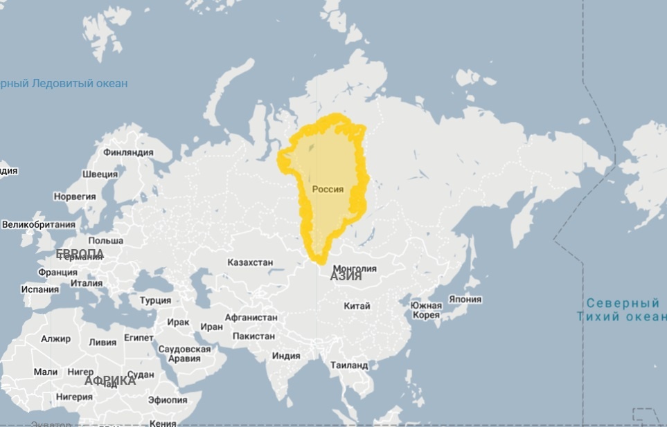 Вот например, размер Гренландии на фоне России, впечатляет не правда ли? Европа вообще меркнет на фоне размеров Гренландии: А теперь на фоне США. Размер Гренландии всего в 4 раза меньше американской земли: Гренландия меньше Австралии в 3 раза: Если посмотерть на плоскую карту, то Гренландия и вовсе гигант: Но всему виной иллюзия плоских карт, поскольку чем выше к северному полюсу на плоской карте, тем страна кажется более крупной. Это ярчайший пример картографического искажения, растягивающего земли у полюсов. Но размеры Гренландии в любом случае впечатляют, это самый крупный остров планеты, площадь которого составляет - 2 166 086 км² С севера на юг Гренландия протянулась на около 2670 км. Это больше, чем расстояние от Москвы до Берлина (~1600 км). Гренландия — это крупнейший в мире остров с наименьшей плотностью населения, чья судьба определяется ледяным щитом глобального значения. Но сегодня судьбу островитян решают в Белом доме.
