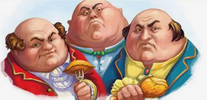 Как обычно, от тревоги Три Толстякам начали жиреть. У одного из них запонка впилась в горло, и с треском лопнул его ослепительный воротничок. Второй кричал, чтобы его спасли, так как он жиреет. А Третий уныло смотрел на свое брюхо. Поэтому перед Государственным советом встало два вопроса: придумать средство для прекращения жирения и подавить беспорядок в городе.