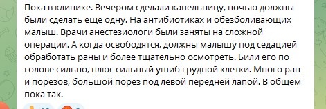 Доброго времени, дорогие друзья! Сегодня у нас в чатах ни фото, ни видео. Идет активное обсуждение вчерашнего ЧП в СНТ. По осмотру у щенка (его назвали Блэк): множество колотых и резаных ран. Сильнейший ушиб грудной клетки. Многочисленные удары по голове. Малыш тяжелый. Пока на стационарном лечении. Принимаем от Вас посылки: