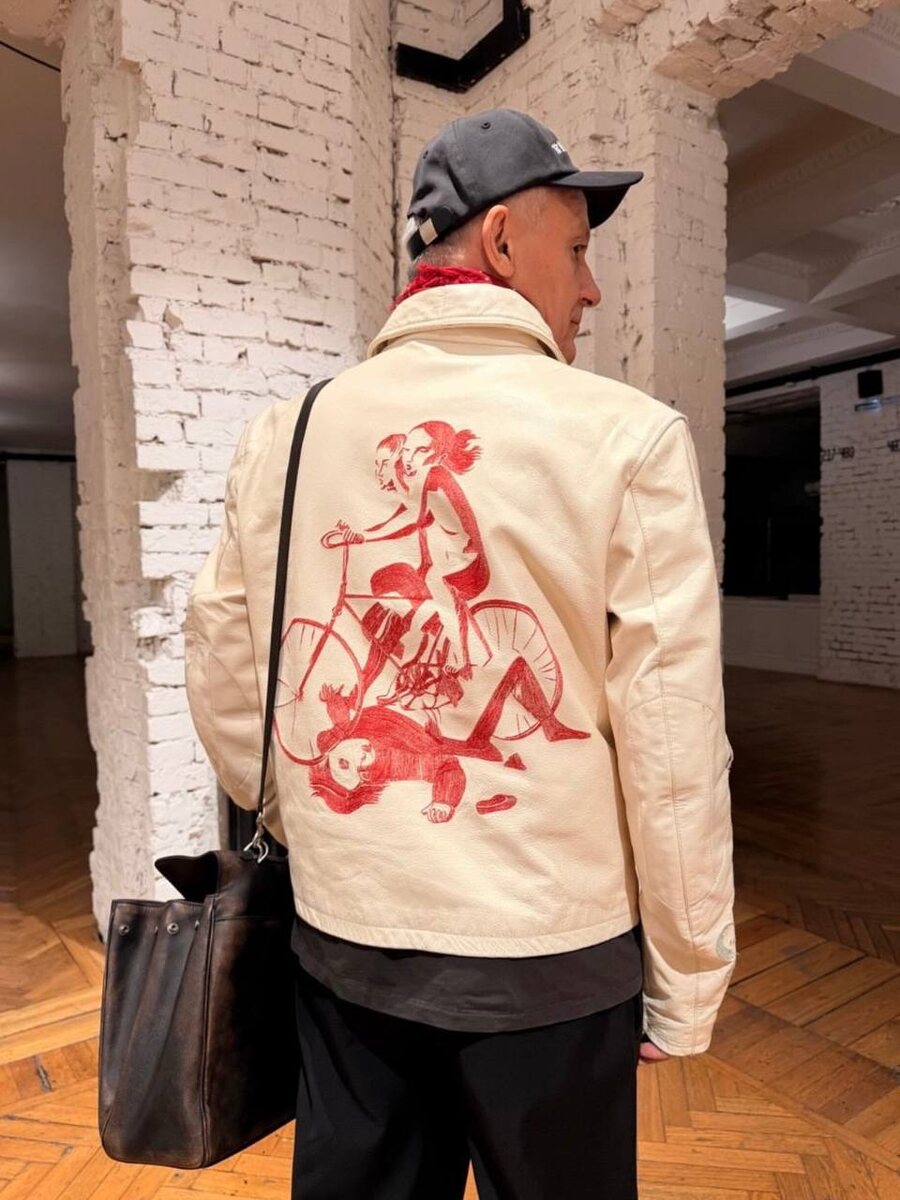 Художественный руководитель и директор Московского драматического театра, актер и режиссер Олег Меньшиков в кожаной куртке и футболке Enfants
