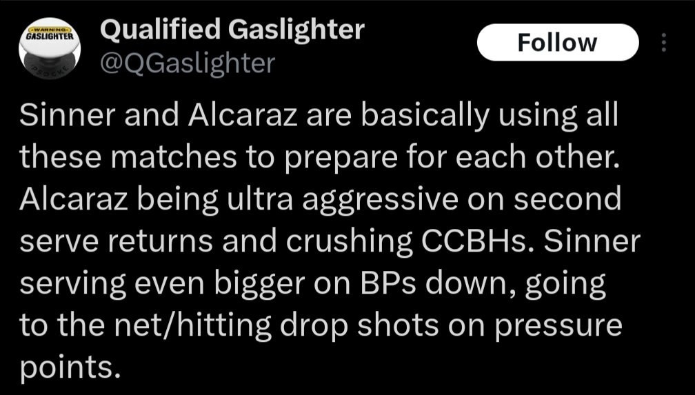 😂 "Квалифицированный Газлайтер" По сути, Синнер и Алькарас используют все эти матчи, чтобы подготовиться друг к другу. Алькарас ультра-агрессивен на приеме второй подачи и сокрушает кросс-корт бэкхенды. Синнер подает еще сильнее на брейк-поинтах, выходит к сетке/бьет укороченные на важных очках. Подпишись на Эйс и точка