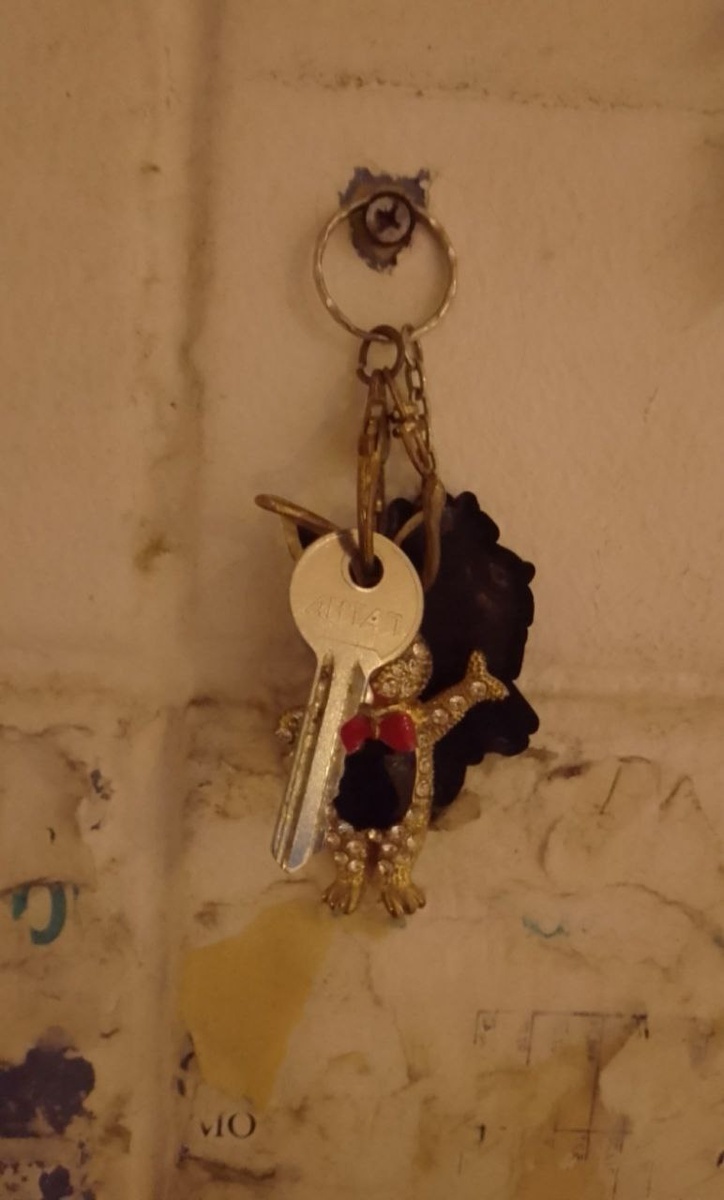 Добрый день. Висит ключ с брелоком "заяц в стразах", на гвоздике у первого подъезда Левобережье 15.
