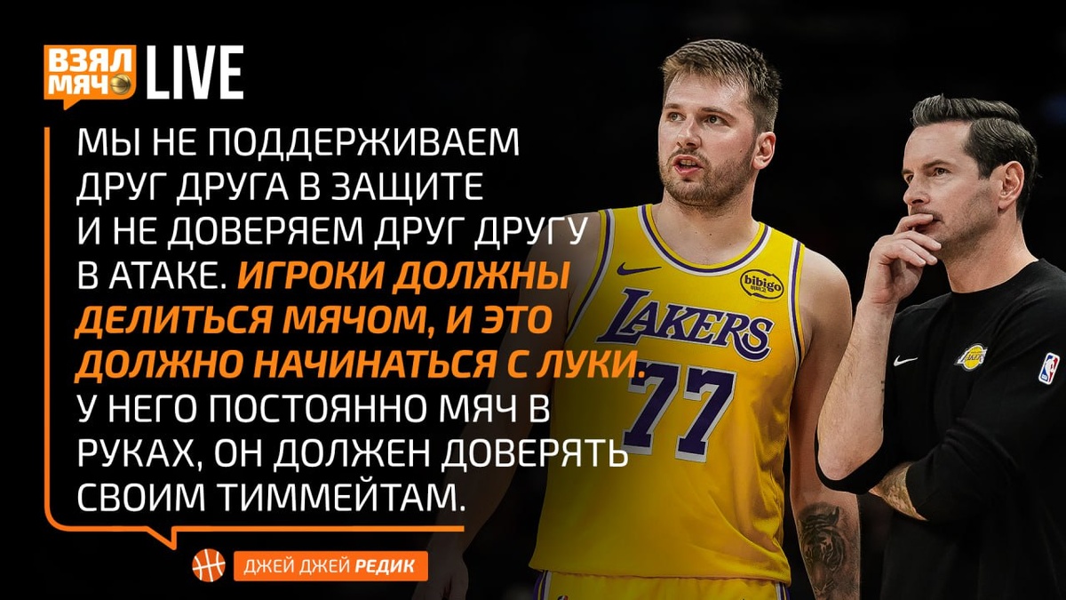 »? Команда из Лос-Анджелеса сегодня разгромно проиграла «Кливленду». Дончич продолжает выдавать яркие индивидуальные перфомансы, но командный результат вызывает вопросы: уже завтра «Лейкерс» могут опуститься на 7-е место Запада — в зону плей-ин. После недавнего поражения от «Клипперс» Джей Джей Редик дал понять, что Лука недостаточно делится мячом, и это сказывается на игре всей команды. Согласны с мнением главного тренера? Прямо сейчас в прямом эфире #ВзялМячLive обсуждаем этот вопрос. Залетайте 👇 😉 YouTube 😄 ВКонтакте 😌 Telegram 🏀 ПОДПИШИСЬ — ЗДЕСЬ ЖИВЁТ БАСКЕТБОЛ!