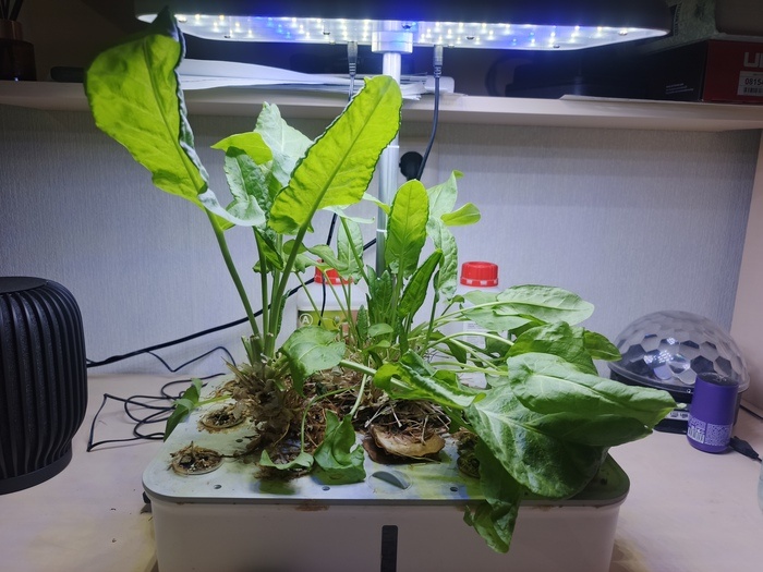 Всем привет! В 2024 году я купил маленькую гидропонную ферму на озоне и думал, что буду заниматься и прям экспериментировать. В прошлых постах я писал, что посадил базилик, салатную горчицу и мой любимый щавель (обожаю суп из щавеля, топ-1 в моем списке личном). Поначалу я прислушивался к комментариям, мерил там полосками кислотность воды и т.д., даже один раз менял полностью воду полтора года назад... Базилик я попробовал пересадить в горшок (он слишком активно рос), но он благополучно был съеден мной. Салатную горчицу тоже я съел единожды, остальное померло, но щавель, сволочь: На протяжении почти двух лет я собираю урожай каждые 2 месяца, которого хватает на 3, 5 литра супа. (на фото - новые выросты уже, урожай собран 3 недели назад). Я, как очень ленивый человек, не меняю воду, удобрения подливаю только когда вспомню про них (раз недели в 3), на ночь отрубаю систему, потому что люблю тишину, а еле слышный звук компрессора фермы мне мешает уснуть, да и просыпаюсь утром в разное врем