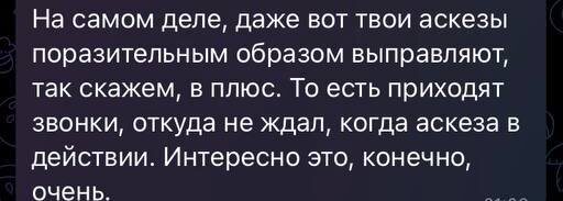 ! Я много чего делала. Вот короткий список, вы можете прочитать про мой опыт: – Голодала месяц. Здесь целый подкаст на эту тему. – Жила несколько суток с закрытыми глазами. Итоги из темноты читать здесь. – Дважды устраивала домашнюю випассану. Прочитай про одну из них. – Исключала глютен, сахар, молочное. Для меня одна из самых легких аскез. И вот день для начала новой аскезы настал. На этот раз аскеза будет длиться ПОЛГОДА!!! Участницам своего Женского Клуба я уже рассказала в чём её суть. Если вам тоже интересно, ставьте 🔥 и я расскажу, когда соберём 10 реакций.
