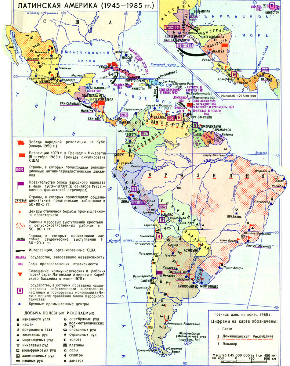 Латинская Америка (1945–1985 гг.). Цит. по: Чумалова Г. Г., Дулова Е. В. Атлас новейшей истории зарубежных стран. 10–11 класс одиннадцатилетней школы. — М.: Картография ГУГК СССР, 1991. — С. 31