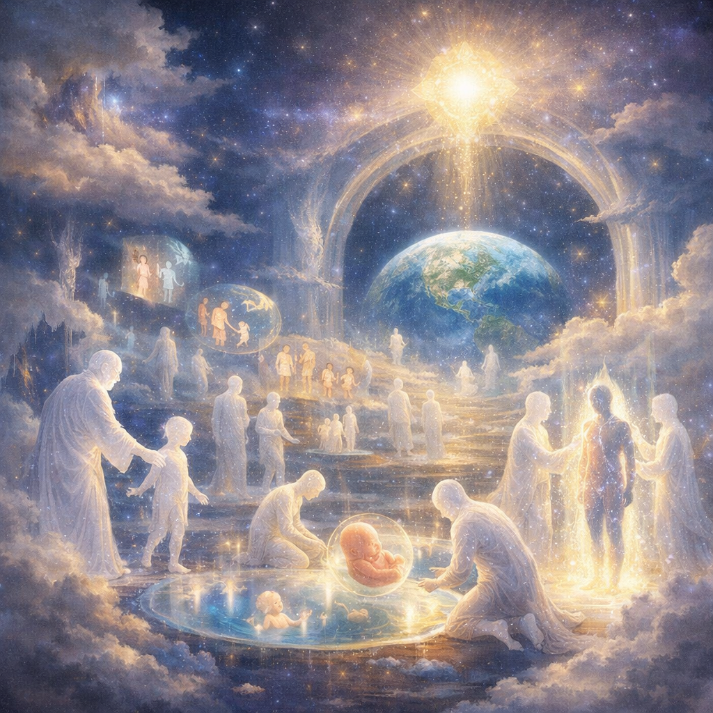 Итог: Перед воплощением души пребывают в месте, напоминающем дом, пространстве, где они чувствуют себя уверенно и спокойно. Вероятно, это место похоже на уютную, домашнюю атмосферу, окружённую более мудрыми и опытными душами. Здесь каждая душа выбирает свой путь: определяет, какую энергию и какие уроки хочет пройти в новой жизни. Выбор основывается на кармических уроках из прошлых воплощений или на необходимости отработать свои задачи.