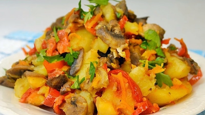 · Выложите к грибам болгарский перец, готовьте 5 минут.