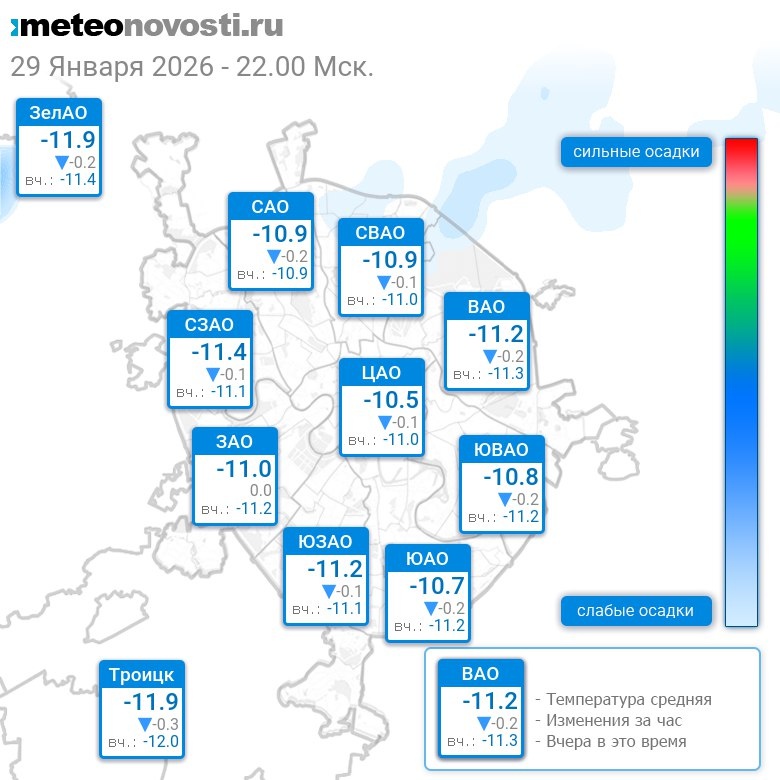 В 22:00 в Москве было от -12.1°C до -10.2°C, средняя температура -11°C #погода #Москва #зима #температура #29января #четверг
