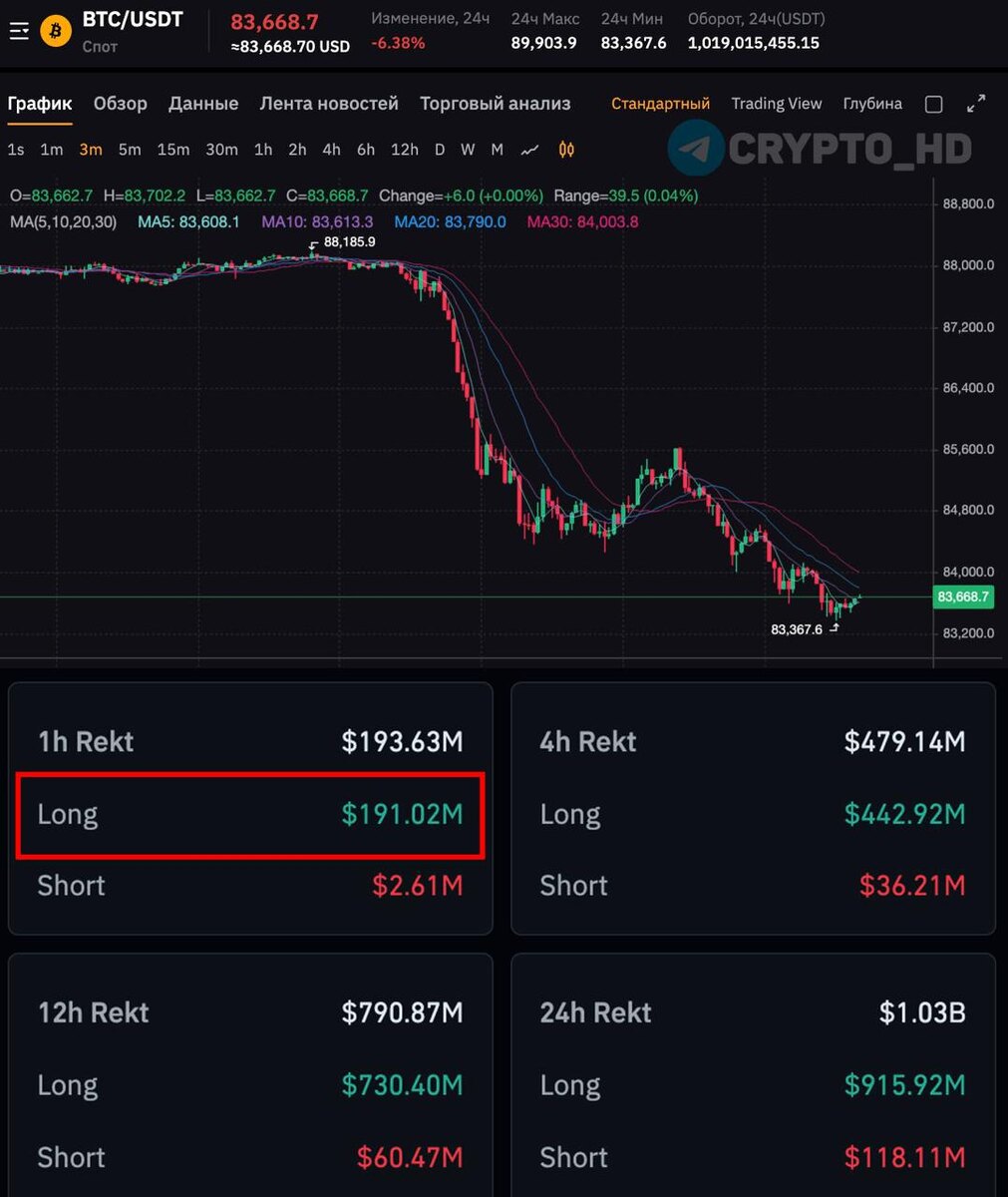 Сoinglass: За 1 час ликвидировано LONG-позиций на $191,000,000.
