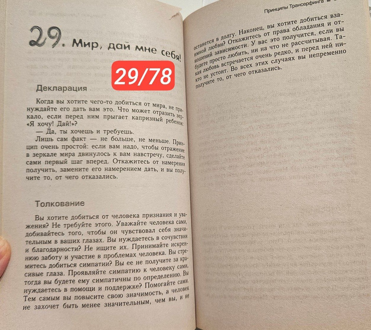 29/78 Практикум управления реальностью - Трансерфинг Мир, дай мне себя! "Если вам надо, чтобы отражение в зеркале мира двинулось к вам навстречу, сделайте сами первый шаг вперед. Откажитесь от намерения получить, замените его намерением дать, и вы получите то, от чего отказались." "Вы хотите добиться от человека признания и уважения? Уважайте человека сами, добивайтесь того, чтобы он чувствовал себя значимым в ваших глазах. Вы нуждаетесь в сочувствии и благодарности? Принимайте искреннюю заботу и участие в проблемах человека. Вы стремитесь добиться симпатии? Проявляйте симпатию к человеку сами, тогда вы будете ему симпатичны по определению. Вы нуждаетесь в помощи и поддержке? Помогайте сами. Тем самым вы повысите свою значимость, а человек не захочет быть менее значительным, чем вы, и не останется в долгу. Хотите добиться взаимной любви? Откажитесь от права обладания и отношений зависимости. У вас это получится, если вы будете просто любить, ни на что е рассчитывая. Такая любовь в