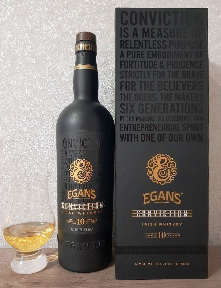 Загадочный "премиальный" бленд с довыдержкой в старом коньяке попался на хорошей скидке. В чатах "купи-продай" его не предлагают. В масс-маркете не видел. В бутиках около семи-восьми тыс рублей. В некоторых ещё дороже - вплоть до 19-ти. Возможно, из-за внешней эффектности чёрной матовой бутылки и представительной, массивной, плотной и тяжёлой упаковки и обязательного примечания в аннотациях - "премиальный". Ну, или другой вариант: кто-то что-то прознал о его каких-то особых вкусовых качествах.. но это не точно) В общем, какой-то таинственный эликсир в мире 10-летних блендов, получается. Тем не менее, оказался достоин отдельной дег-заметки: интересен как на аромате, так и на вкусе. На лицевой стороне коробки многословное объявление о том, что производитель отмечает вместе с выпуском этого релиза свою убеждённость в его коммерческой успешности, и порукой тому шесть смелых и умелых поколений семьи Иган. Egan’s Conviction 10 YO, Blend. Крепость - 46%. Без фильтрации и без колера. В состав