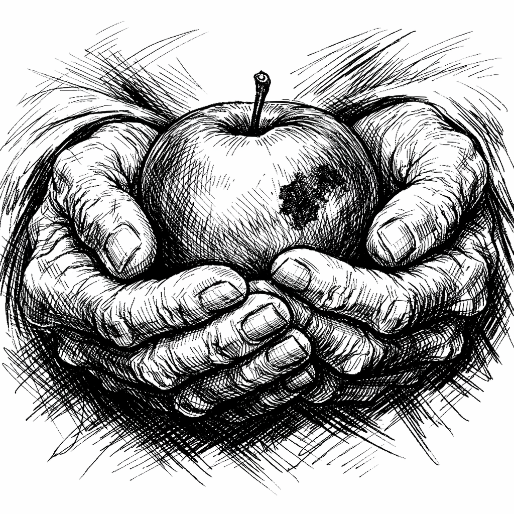 Джордж выжидающе смотрит на сына. Алекс уходит и через полминуты возвращается с яблоком. Теперь Бобби может разглядеть его повнимательнее. Почему оно такое неровное? И что это за чёрное пятнышко на боку?