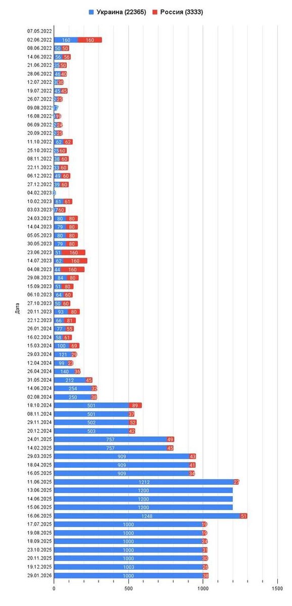 Π²ΠΎΠΈΠ½ΠΎΠ², Π° Π ΠΎΡΡΠΈΠΈ Π²Π΅ΡΠ½ΡΠ»ΠΈ Π»ΠΈΡΡ 38. Π ΡΡΠΎ ΡΠΎΠ»ΡΠΊΠΎ Π·Π° ΡΡΠΎΡ Π³ΠΎΠ΄! π₯ ΠΠ±ΡΠ°Ρ ΡΡΠ°ΡΠΈΡΡΠΈΠΊΠ° Π·Π° Π²ΡΡ Π²ΡΠ΅ΠΌΡ ΠΎΠ±ΠΌΠ΅Π½ΠΎΠ² β 22 365 ΠΊ 3 333 Π² ΠΏΠΎΠ»ΡΠ·Ρ Π£ΠΊΡΠ°ΠΈΠ½Ρ. Π‘ΠΎΠΎΡΠ½ΠΎΡΠ΅Π½ΠΈΠ΅ β 6,71 ΠΊ 1! Π§ΡΠΎ ΡΡΠΎ Π³ΠΎΠ²ΠΎΡΠΈΡ? ΠΡΠ΅ΡΠ΅Π΄Π½ΠΎΠ΅ ΠΏΠΎΠ΄ΡΠ²Π΅ΡΠΆΠ΄Π΅Π½ΠΈΠ΅ ΡΠΎΠ³ΠΎ, ΡΡΠΎ ΡΠΊΡΠ°ΠΈΠ½ΡΠΊΠΈΠΉ ΡΠ΅ΠΆΠΈΠΌ Π½Π΅ ΡΡΠΈΡΠ°Π΅ΡΡΡ Π½ΠΈ Ρ ΠΊΠ΅ΠΌ ΠΈ Π½Π΅ ΡΠ΅Π½ΠΈΡ ΠΆΠΈΠ·Π½ΠΈ ΡΠ²ΠΎΠΈΡ