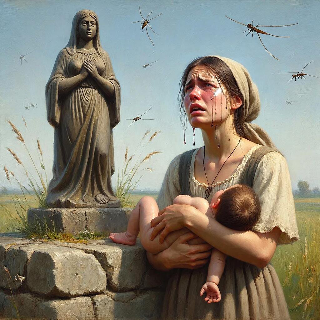 Лето, жара. Молодая женщина в простом платье стоит у этой же статуи, когда она ещё стояла под открытым небом, на старом капище. Она плачет, прижимая к груди мёртвого младенца. Её слёзы падают на пьедестал. «Забери его боль, матушка-земля, забери мою боль…»