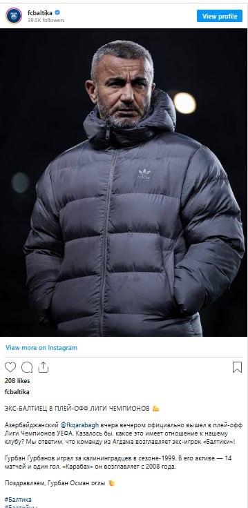 "Балтика". Поздравление было опубликовано на официальной странице российского клуба в соцсети Instagram. "Азербайджанский клуб "Карабах" вчера вечером официально вышел в плей-офф Лиги Чемпионов УЕФА. Казалось бы, какое это имеет отношение к нашему клубу? Мы ответим, что команду из Агдама возглавляет экс-игрок "Балтики"!" - говорится в публикации. Напомним, что в 1999 году Гурбан Гурбанов провел в составе "Балтики" 14 матчей и отметился одним забитым мячом. ✈️ Новости Азербайджана 🔗 Написать нам #ruoxuaz #ГурбанГурбанов #ФККарабах #ЛигачемпионовУЕФА