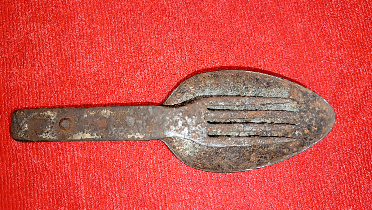Теперь о сегодняшней находке. Шведская армейская ложка-вилка — комбинированный столовый прибор из легированной стали. Стандартное военное снаряжение начала двадцатого века. Скандинавы ценили такой металл: устойчив к коррозии, легко чистится, служит десятилетиями.