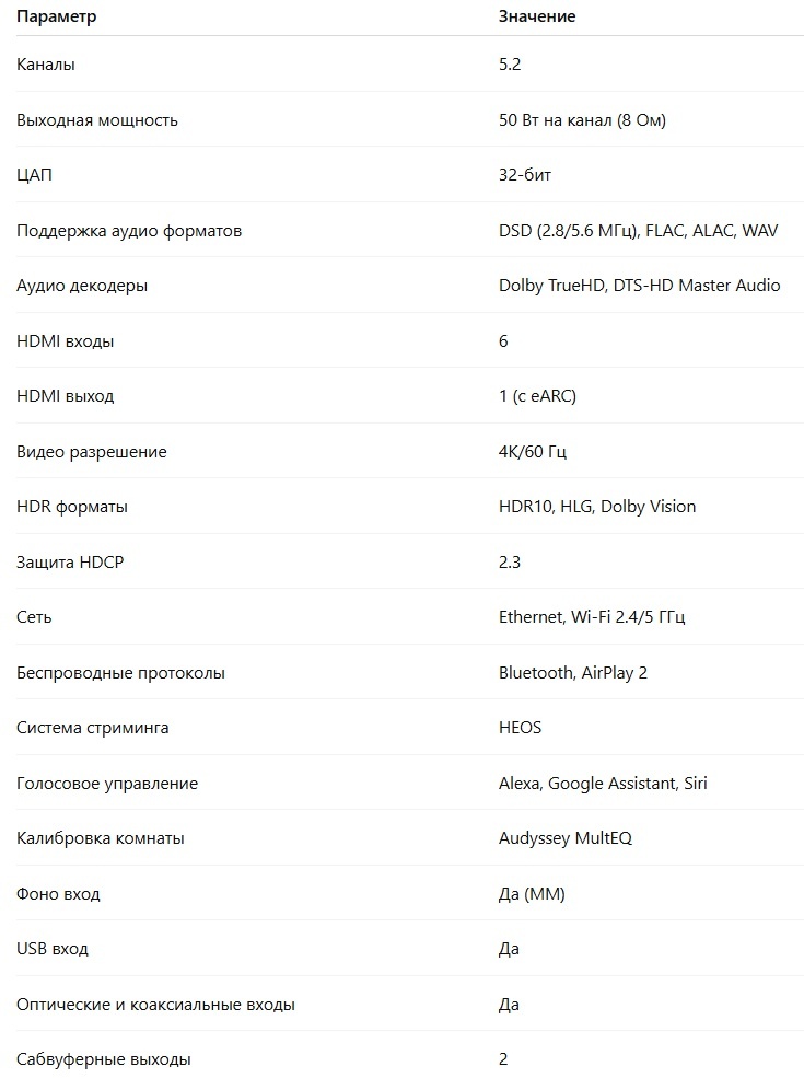 Поддерживаются Spotify, Deezer, Tidal, Amazon Music и другие сервисы. Управление — через приложение HEOS на смартфоне.