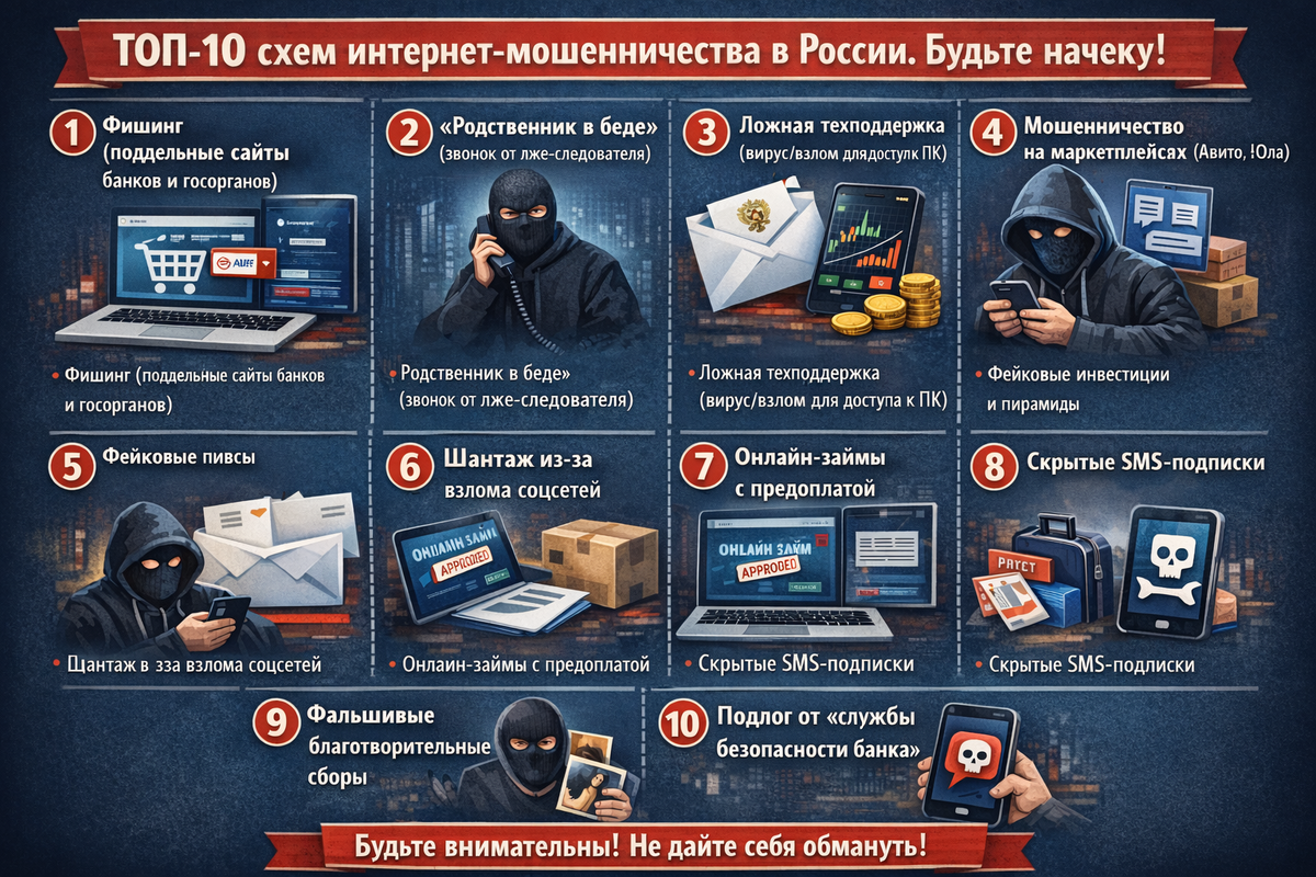- Фишинг от имени банков/госорганов — Поддельные сайты и письма для кражи ваших логинов, паролей и данных карт.