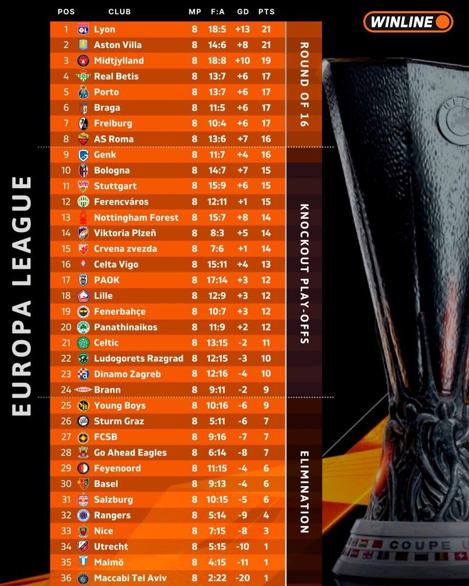 Итоговая таблица общего этапа Лиги Европы 🇪🇺