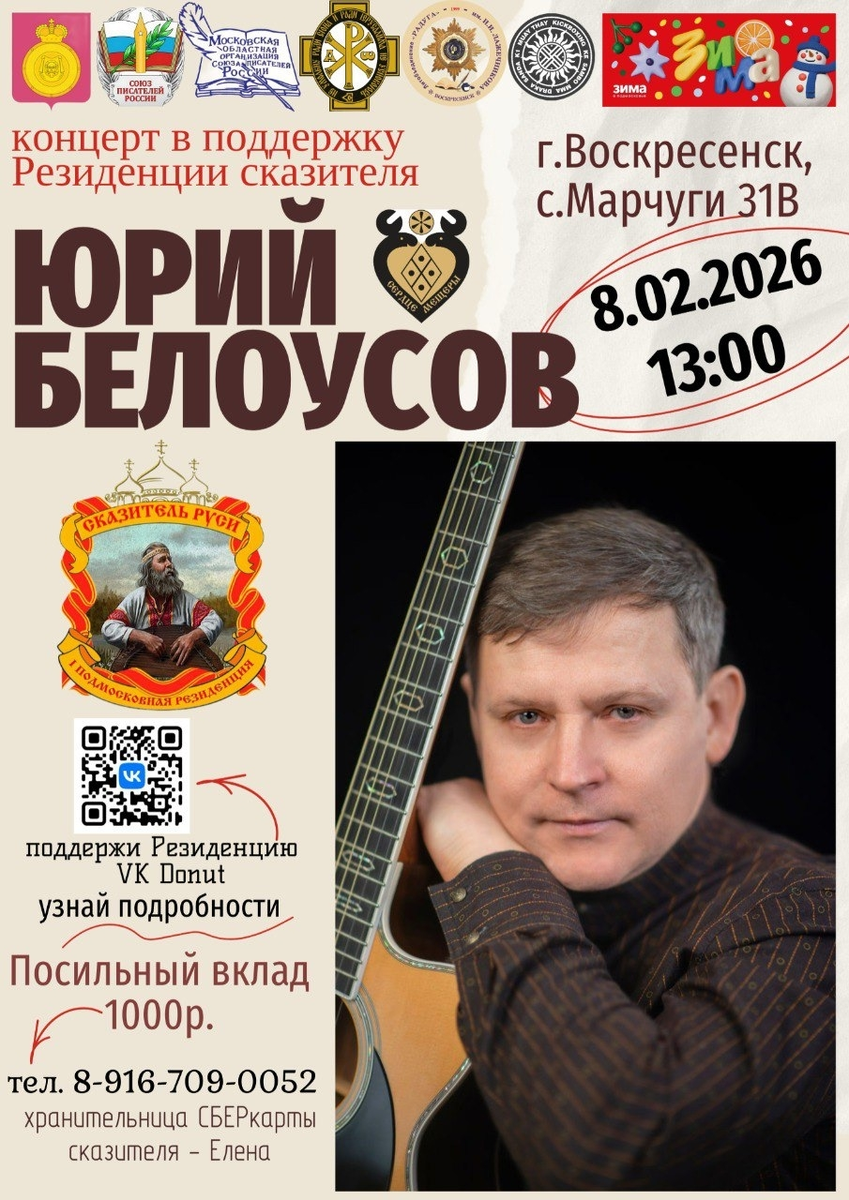 Мы проводим уникальный концерт в поддержку Резиденции. В стенах нашего гостеприимного дома прозвучат лучшие и новые произведения писателя-сказителя, автора-исполнителя более 500 песен и рассказчика сотен удивительных сказов, создателя резиденции - Юрия Белоусова. Мы ждём вас всех — добро пожаловать в уникальную атмосферу русской традиции и творчества!