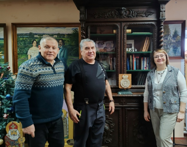 Александр Васильевич в 2013 году помог Юрию Белоусову издать свою первую книгу "Солдатка". Сегодня он привёз в резиденцию каменный герб Воскресенского района (Щит Пожарского!). Таких изделий было изготовлено всего три экземпляра. Свой экземпляр - мэра города, Александр Квардаков передал Сказителю Руси. Это символичный подарок, так как Марчугами владели в своё время и Иван "Берсень" Беклемишев - прадед князя Дмитрия Пожарского - Спасителя Отечества, и его дед - Фёдор Берсенёв, и его мать - Мария. У Дмитрия Михайловича - законного владельца Марчуговской вотчины, здесь стояли его боевые холопы - так называли княжеское войско, или его спецна