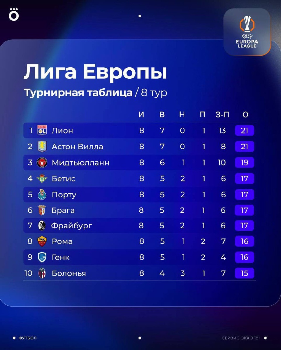 Смотрим на турнирную таблицу Лиги Европы. И приветствуем всех участников плей-офф 🏆