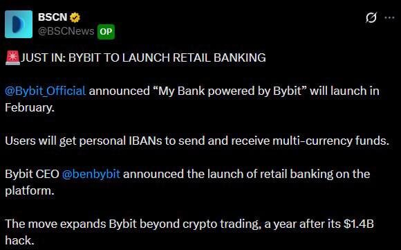 По данным Bloomberg, Bybit делает серьезный шаг в сторону TradFi и фактически перестраивается в формат необанка. ➕ Что добавят: ▪️ Фиатные счета с IBAN (USD, EUR, GBP) ▪️ Возможность получать зарплаты, переводы, выплаты ▪️ Дебетовые карты с Apple Pay и Google Pay ▪️ Автоконвертация крипты в фиат при оплате ▪️ Проценты на остаток фиата Готовы использовать Bybit как основной банк для повседневной жизни? Да — 👍 Нет — 😁