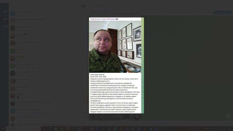 Днём 29 января вначале в одном популярном брянском телеграм-канале «Подслушано Старые Юрковичи» (больше 13 600 подписчиков), а через некоторое время и в другом («Брянск и Бежица») появилось сообщение о героической гибели в зоне проведения СВО «на Волчанском направлении» журналиста Александра Чернова. В посвящённом ему душераздирающем некрологе с датами рождения и смерти (20.04.1979 -25.01.2026) говорилось, что Александр не успел толком-то повоевать, но себя не жалел: