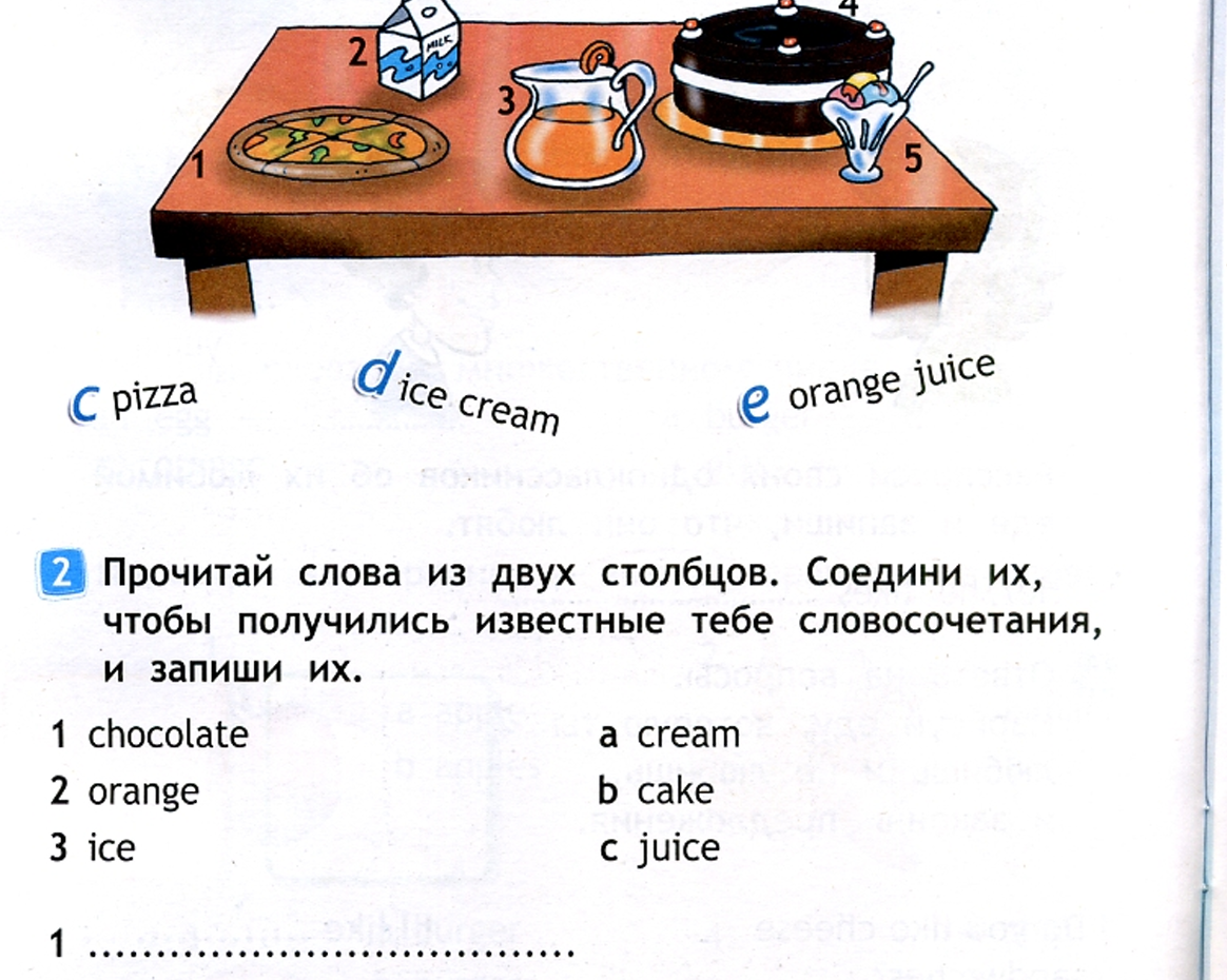 Показываю. Вот задание. Смотрим вместе. Даны три сочетания слов, если можно это так назвать. Они уже написаны. Даны картинки к ним. Они, кстати, есть и в учебнике. В чем задача ученика? Глядя на все это, соединить стрелочками одну часть с другой. Уважаемые дети и родители! По большому счету, здесь вообще знание языка нужно? Здесь так важно, что вы учили немецкий, китайский или кхмерский? Вы не в состоянии проконтролировать процесс соединения стрелочками? А вы, дорогие дети, не в состоянии посмотреть на то, что написано, и соединить? Нет, вот этот этап у меня ученик сделал. Он соединил все правильно. Но это же еще не все! Есть же еще продолжение. Надо же еще записать то, что получилось! Опять же, уважаемые родители, которые учили другие языки, в чем сложность это проконтролировать? Знание немецкого мешает? )) Так вот, а на этом этапе мой ученик потерпел фиаско. ( Потому что он в слове cake потерял букву а. И два сочетания написал так: chocolate juice, orange cake. И получил три. На мои