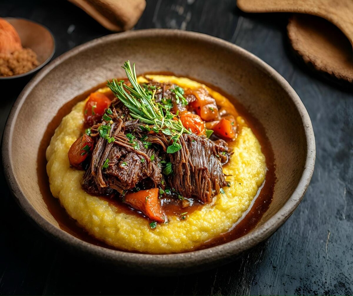 Ингредиенты: Тушеная говядина 1 кг говяжьей лопатки (нарезанной на куски) 1 ст. л. оливкового масла 1 ч. л. соли 1 ч. л. черного перца 1 ч. л. паприки 1 ч. л. чесночного порошка 150 г лука, нарезанные ломтиками 4 зубчика чеснока, измельченные 200 г моркови, нарезанные ломтиками 2 ст. л. томатной пасты 700 г говяжьего бульона 1 ст. л. вустерширского соуса (по желанию) 1 ч. л. сушеного тимьяна (или розмарина) 1 лавровый лист (по желанию) Кремовая полента 1 стакан желтой кукурузной муки (полента) 4 стакана воды (или бульона) 1 ч. л. соли 2 ст. л. сливочного масла ½ стакана сыра пармезан (по желанию, но рекомендуется) Инструкции: Обжаривание говядины: Приправьте говядину солью, перцем, паприкой и чесночным порошком. Нагрейте оливковое масло в кастрюле. Обжаривайте говядину по 2-3 минуты с каждой стороны. Приготовьте ароматные ингредиенты: добавьте лук и морковь. Готовьте 3-4 минуты. Добавьте чеснок и томатную пасту, перемешайте 30 секунд. Тушение: влейте бульон и вустерширский соус. Д