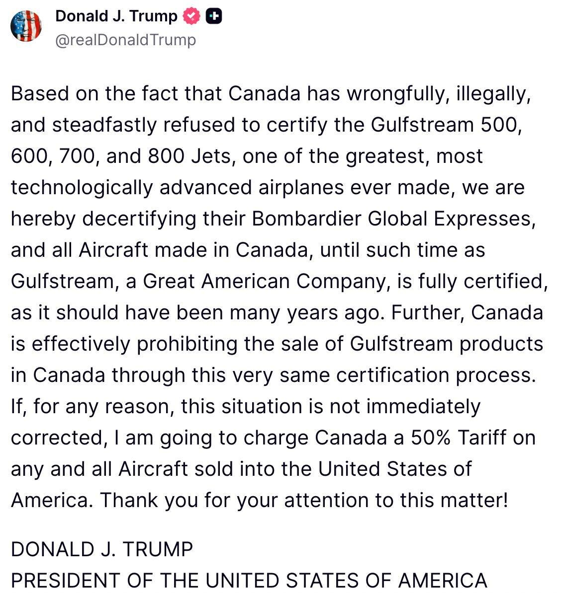Trump also threatens a ’50% TARIFF on any and all Aircraft sold into the United States of America’