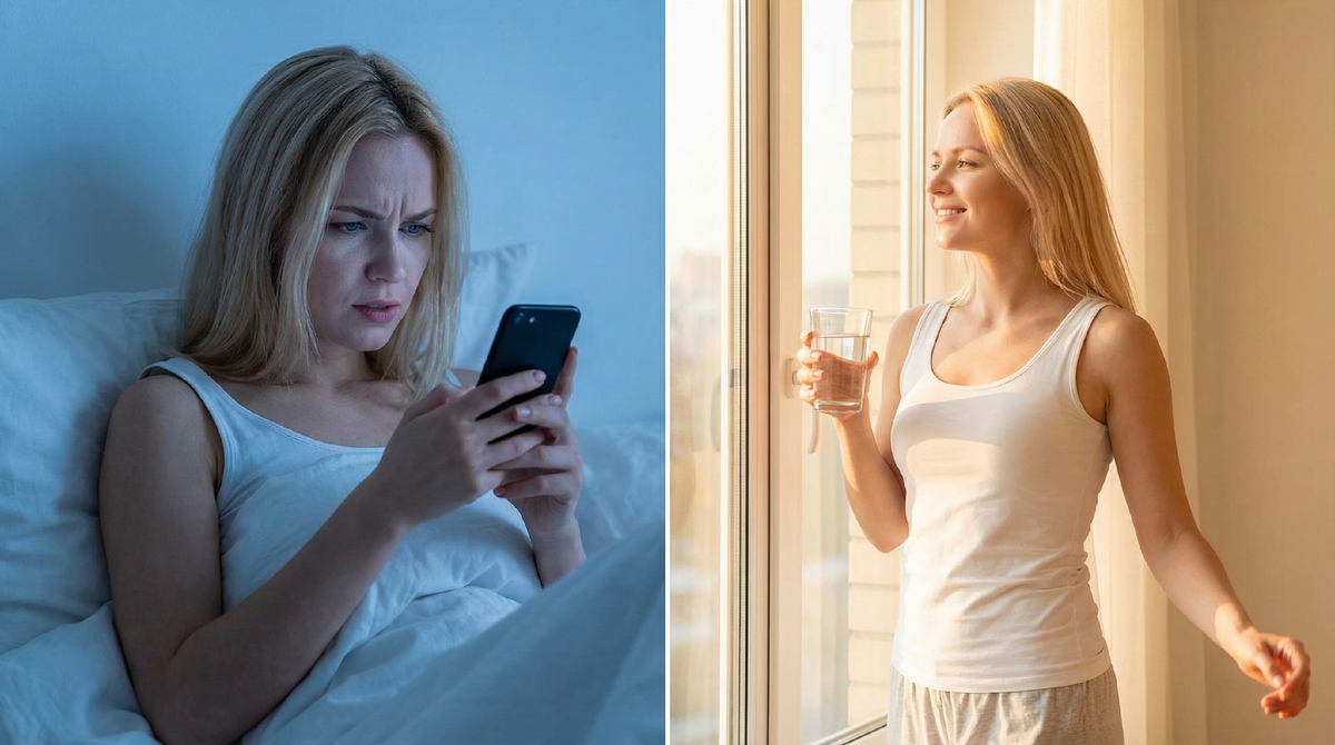 Зарядите телефон вне спальни. Первые 30 минут — вода, свет, движение. Экраны потом.