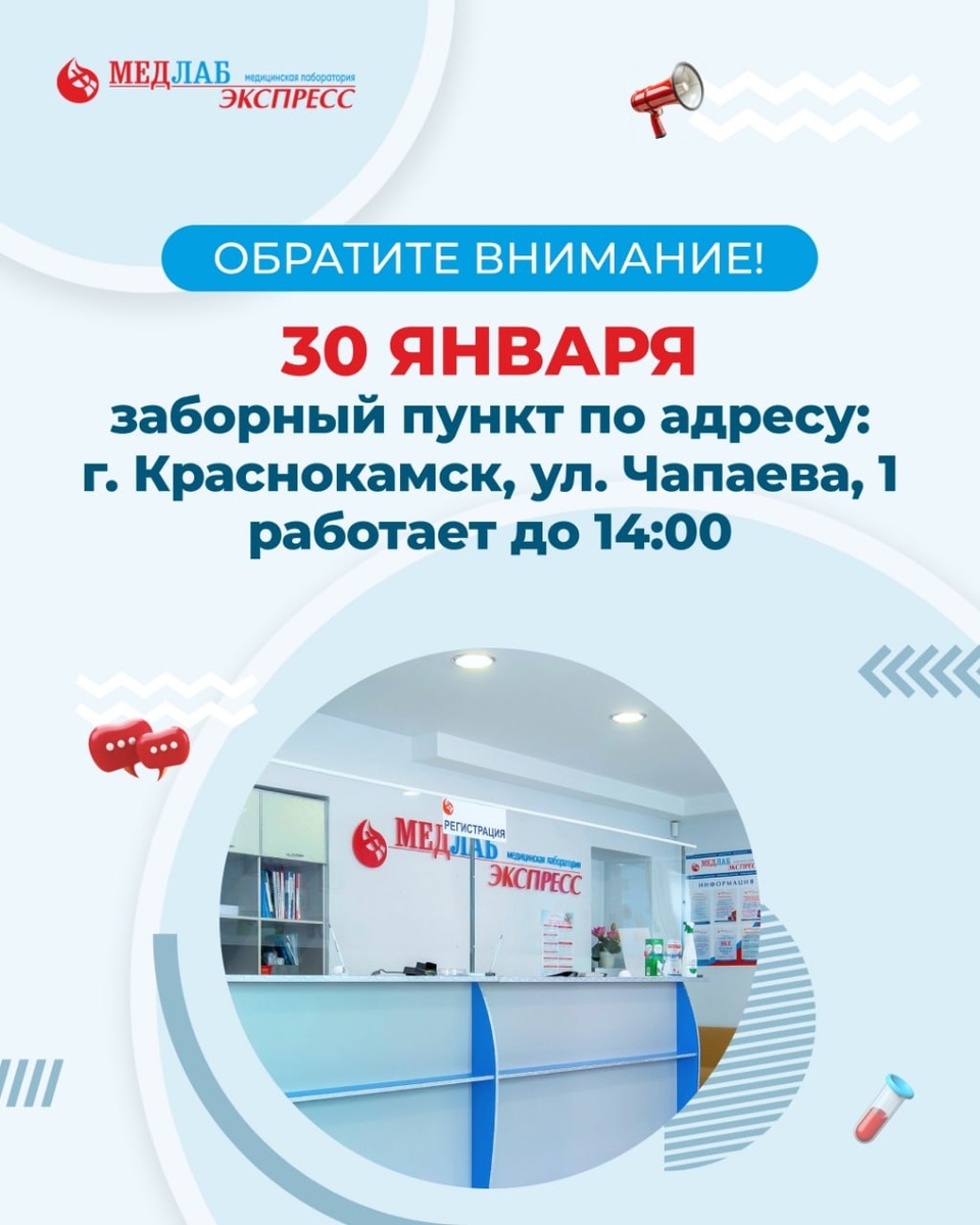❗️По техническим причинам 30 января наш заборный пункт в г. Краснокамск по адресу ул. Чапаева, 1 будет работать до 14:00.