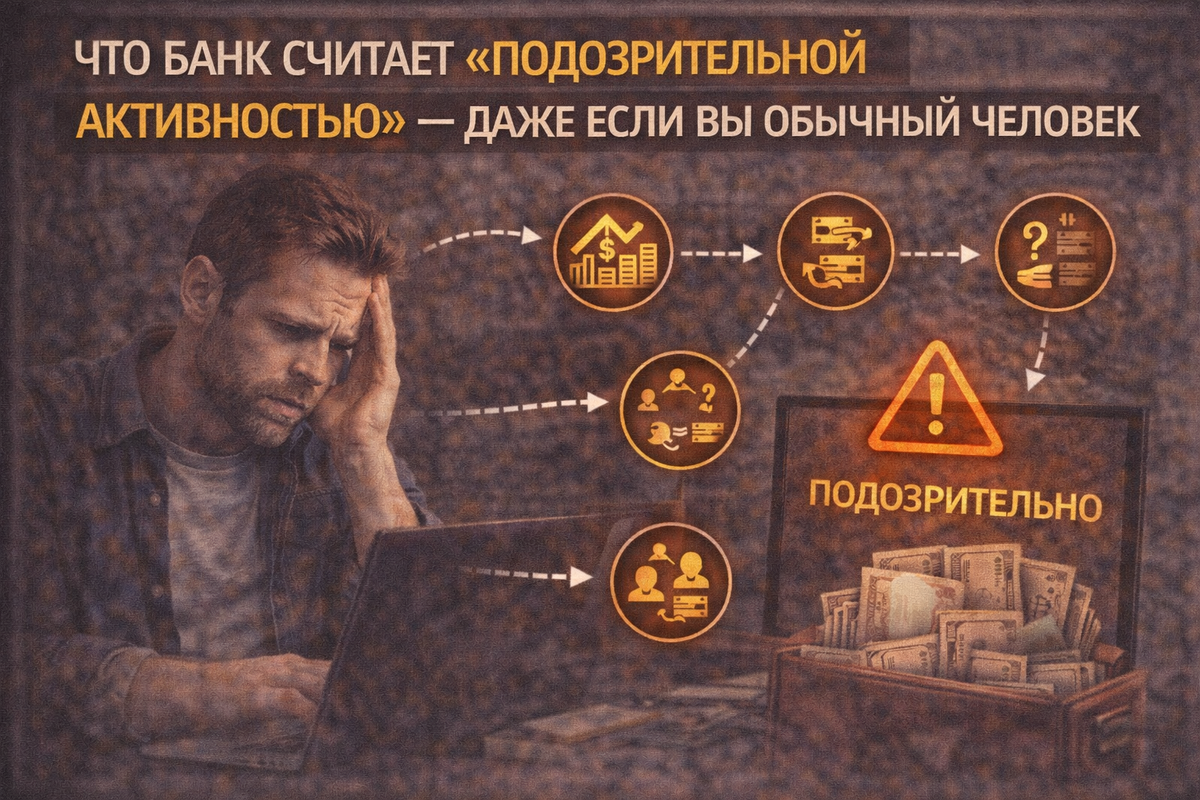 Почему вообще возникли вопросы?» Проблема в том, что банк и человек по-разному понимают слово “подозрительно”. Люди думают: «Подозрительно — это преступление» Для банка это не так. Подозрительно — это: Даже если всё законно. Банк не анализирует вашу жизнь.