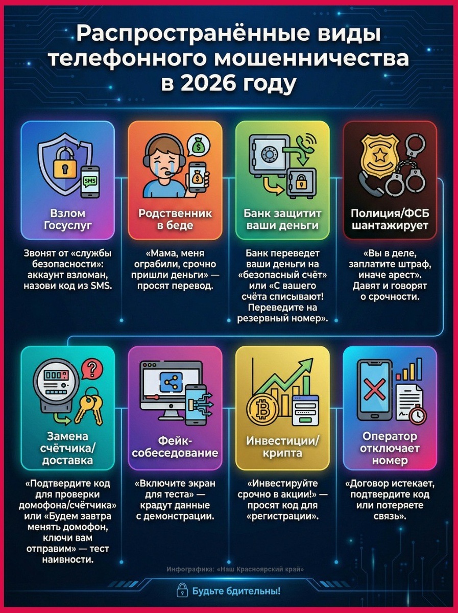 Собрали в карточках распространенные схемы обмана жителей Красноярского края в этом году.