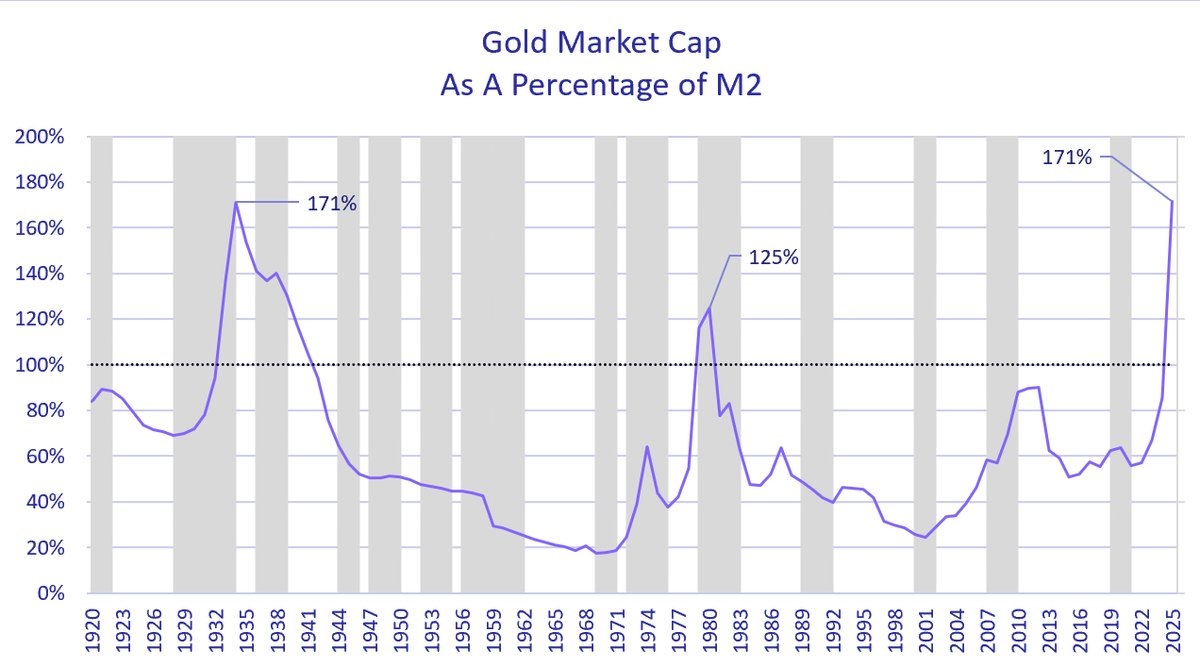 🔸Рыночная капитализация золота в процентах от денежной массы M2 достигла самого высокого уровня почти за столетие