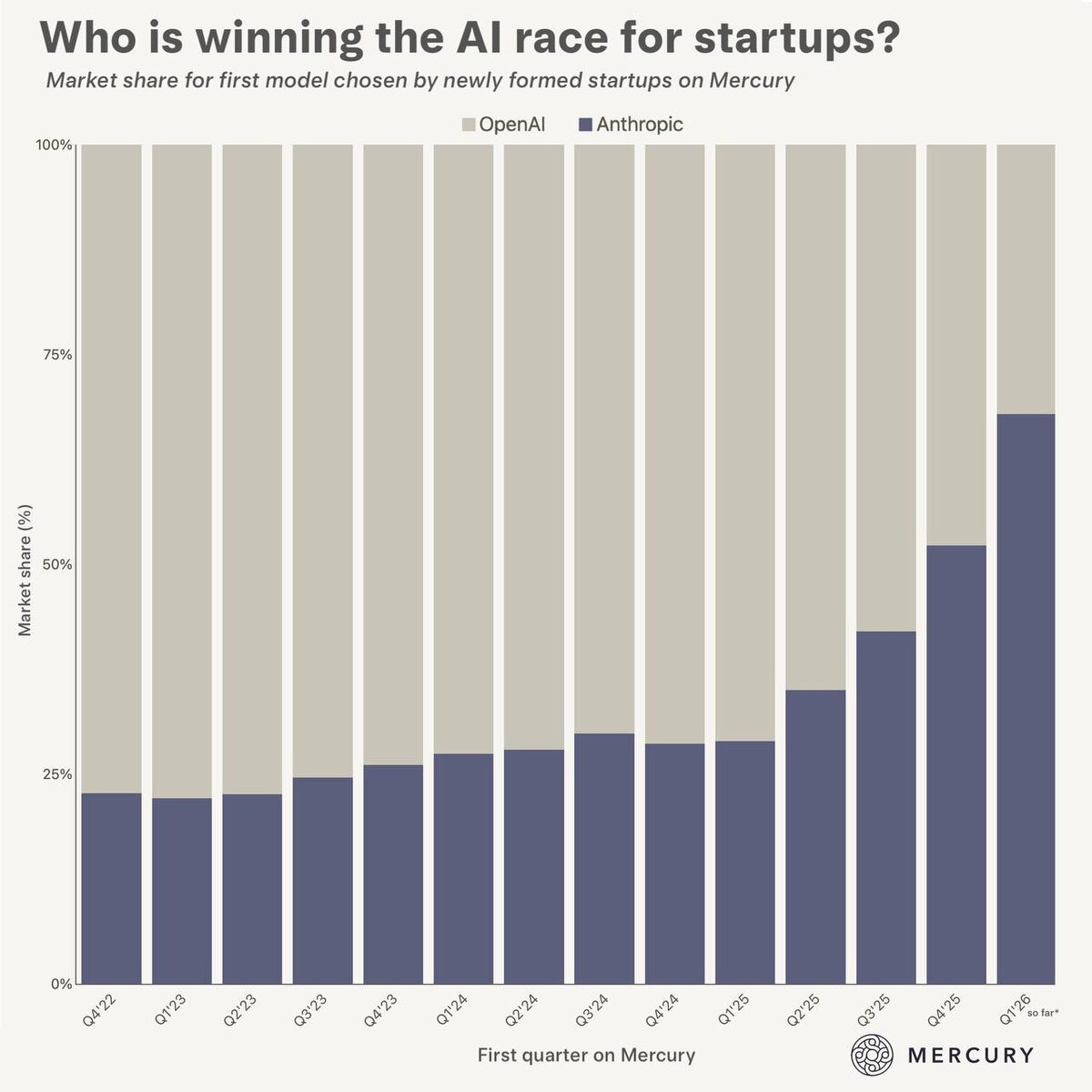 Данные Mercury (банк для стартапов) по тратам клиентов на AI провайдеров. Q4 2022: Anthropic ~22%, OpenAI ~78% Q4 2025: Anthropic ~52%, OpenAI ~48% Q1 2026: Anthropic ~67%, OpenAI ~33% Тренд очевиден - новые стартапы все чаще выбирают Claude. Claude Code и Opus 4.5 стали переломным моментом, а стартапы - самые быстрые в адаптации к новым инструментам. #anthropic #openai #ai #startups ————————— Мысли Рвачева —————————