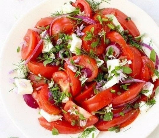 Зимой всегда хочется чего то необычного, да ещё витаминного и вкусного. Предлагаю вот такой вариант аппетитного салатика. Итак, томатный салат с красным луком. Помидоры - 300 грамм. Красная луковка - 1 шт. Сыр фета - 70-80 грамм. Масло растительное - 1 столовая ложка. Красный винный уксус - 1 столовая ложка. Горсть укропа, ложка листьев орегано, пару ложек каперсов, цветочки лука по желанию, соль, перец по вкусу. Приготтвить совсем просто, режем помидоры, добавляем каперсы, сыр фета. Посыпать свежим орегано, укропом и цветами лука. Масло смешать с уксусом и заправить салат. Приправить солью и перчиком. Перемешать и ещё чуть укропчику сверху украсить.
