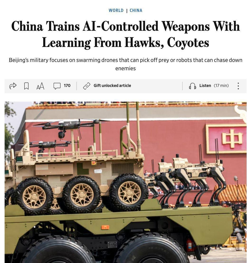 Китайские разработчики обучают оружие, управляемое ИИ, и рои беспилотников, копируя то, как ведут охоту ястребы и волки/койоты