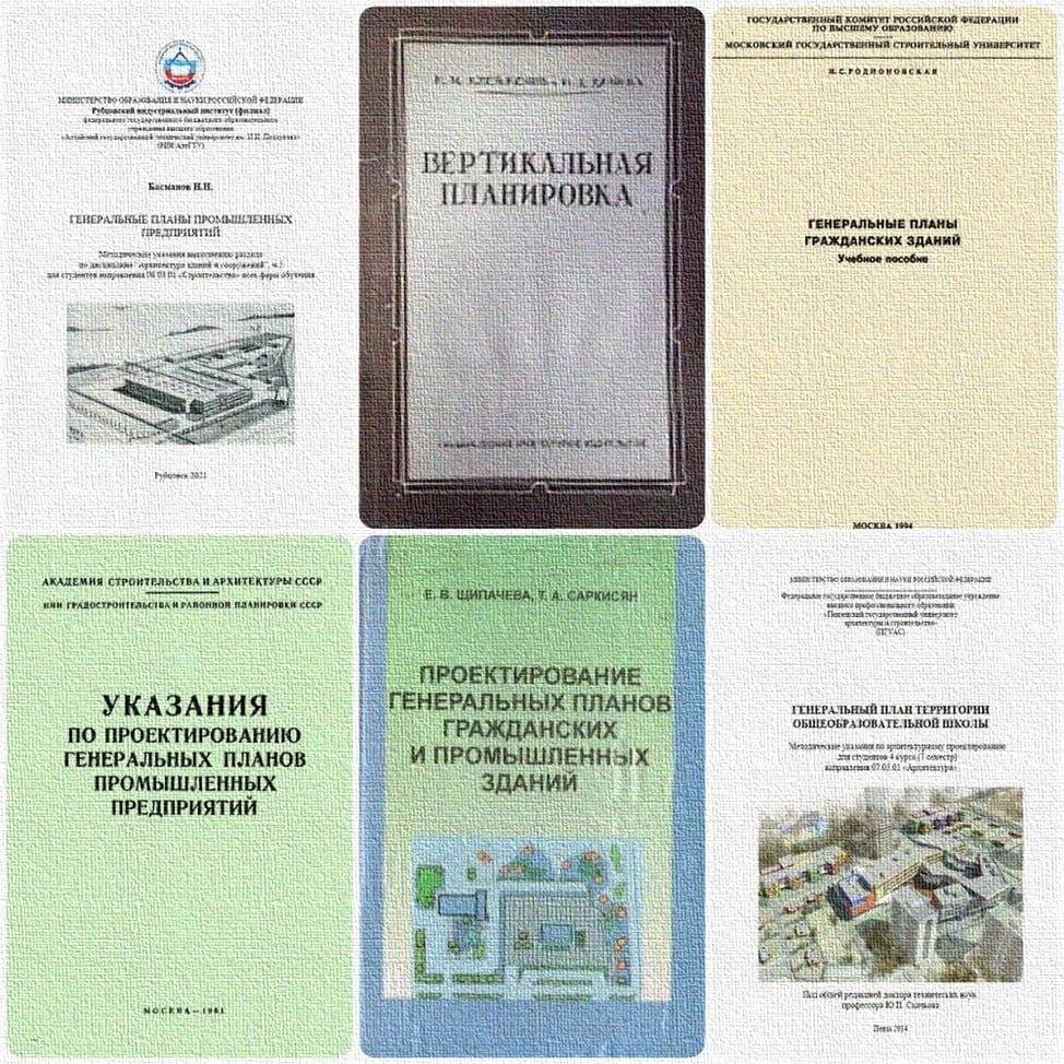 Подборка технической литературы Генеральные планы промышленных предприятий Автор: Басманов Н. Н. Вертикальная планировка Автор: Клейменов Н. М. Генеральные планы гражданских зданий Автор: Родионовская И. С. Указания по проектированию генеральных планов промышленных предприятий Издательство: Академия строительства и архитектуры СССР Проектирование генеральных планов гражданских и промышленных зданий Автор: Щипачева Е. В., Саркисян Т. А. Генеральный план территории общеобразовательной школы: методические указания по выполнению курсового проекта Автор: Щур О. А., Туманов В. Н.