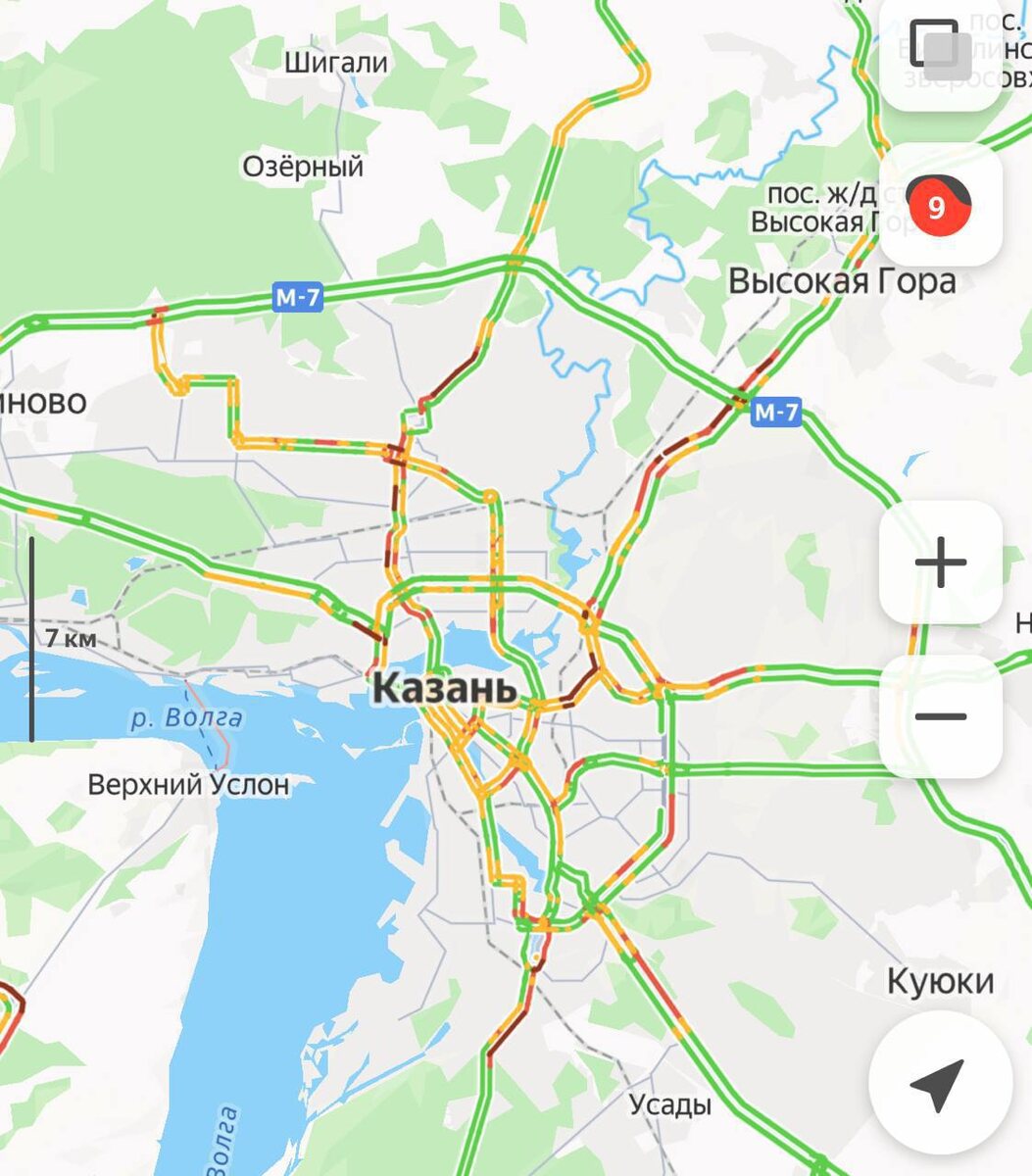 Пробки в Казани в эти минуты уже достигли 9 баллов.