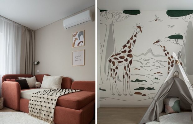 Детская комната как место для творчества и вдохновения Выбор сюжета для детской комнаты — это всегда задача «со звездочкой». Дизайнеру необходимо найти баланс: вписать пространство в общую стилистику квартиры и при этом учесть возраст маленького хозяина. В проекте Виктории Капитановой для очаровательного малыша по имени Лёва этот пазл сложился идеально. Когда Виктория встретилась с родителями Льва, они обратили внимание, что необходимо создать комнату, в которой малыш сможет не только спать, но и играть, развиваться. «Комната должна стать местом для творчества и вдохновения», — делится дизайнер. Основная часть квартиры оформлена в естественной стилистике: плавные формы, светлые оттенки и использование натуральных материалов, таких как дерево и камень. Бежевый цвет стен дополнен нежными зелеными акцентами, создавая легкую и уютную атмосферу. Именно этот фон стал основой для детской комнаты. Чтобы соединить общий концепт и имя маленького владельца, Виктория выбрала интересную тему — сафа