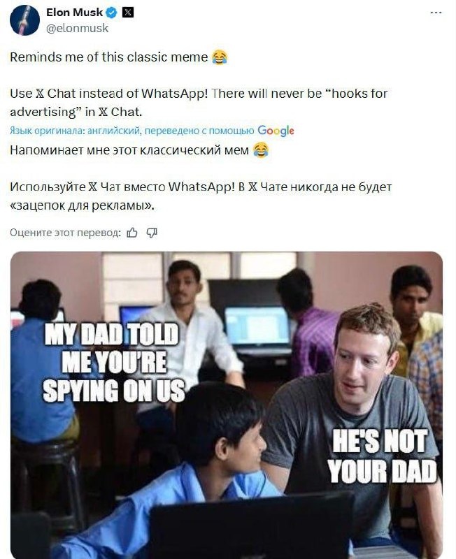 Илон Маск ответил мемом с Цукербергом на новость о том, что власти США изучают, есть ли у Meta* доступ к закрытым чатам в WhatsApp