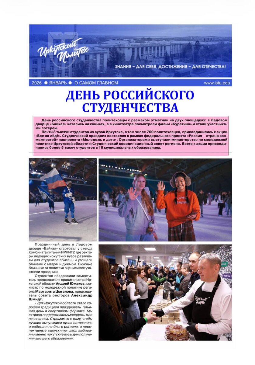 📰 🗣День российского студенчества 🗣Стипендии Президента и Правительства РФ получат 16 студентов политеха 🗣Стартап-студия ИРНИТУ - курс на технологические проекты 🗣 Иркутский Политех укрепил позицию в рейтинге Times Higher Education 2026 🗣Международный инженерный институт 🗣Автобус для студенческих поездок — подарок Эн+ 🗣Новое пространство цифрового будущего 🗣 Учебные стенды по электротехнике от ИНК 🗣День открытых дверей в ИРНИТУ 🗣Хоккей — «УниверЛига регионов» 🗣Лыжные старты 🗣Боксерское «серебро» Обзор ключевых новостей подготовлен пресс-службой ИРНИТУ. #иркутский_политех #ирниту #газета 👻 МАХ | 💙 ВК | 📝 ДЗЕН