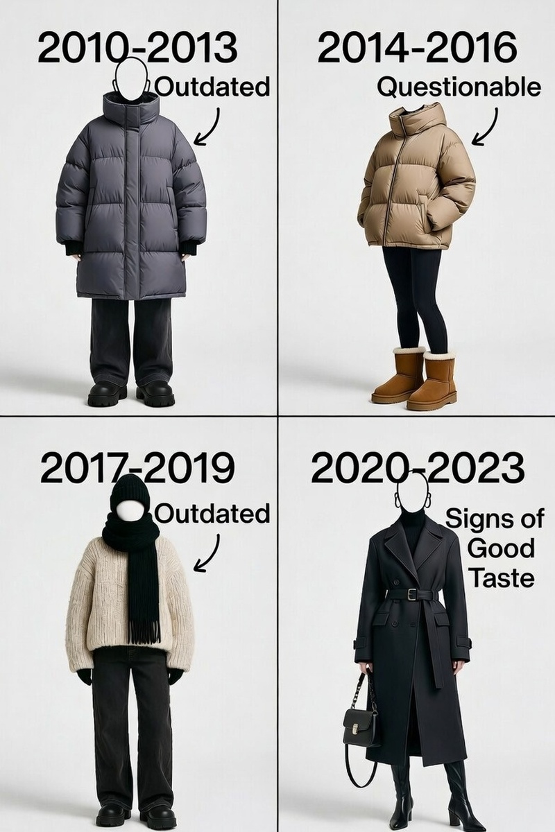 Устаревшие вещи — это не просто одежда, которая вышла из моды. Это отражение ушедших ценностей, когда важнее было выглядеть модно, чем чувствовать себя комфортно, когда количество значило больше качества, а броскость — больше элегантности. Современный зимний гардероб отражает более зрелый, осознанный подход к жизни и потреблению.