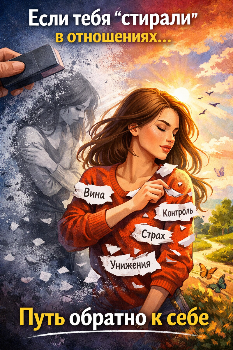 Это про то, что ты долго жила рядом с человеком, после которого становилось всё меньше тебя: меньше голоса, меньше желаний, меньше свободы. Как будто тебя аккуратно, день за днём, стирали.