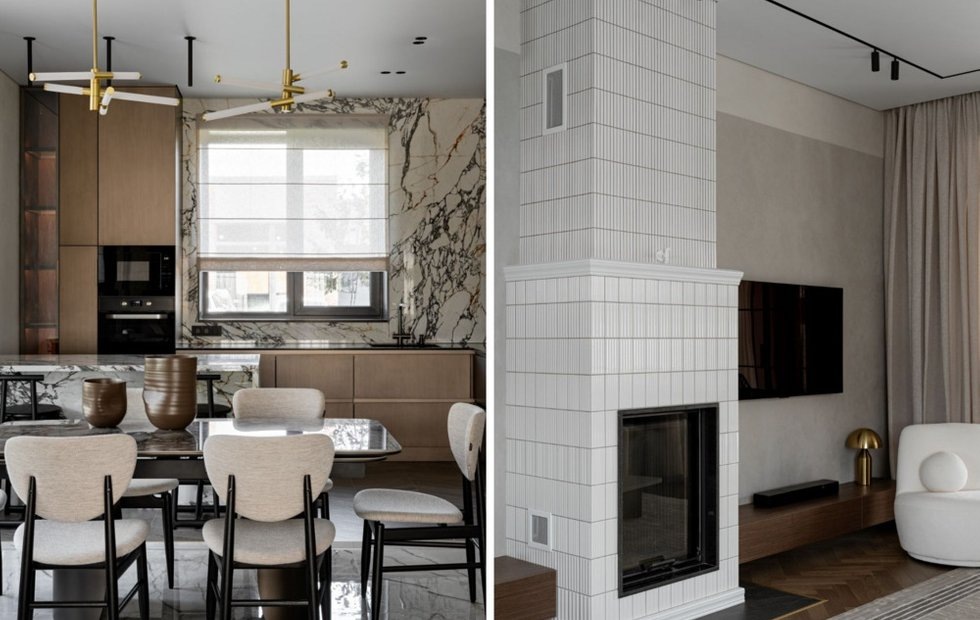 В доме объединена кухня-гостиная, открытая через портал, из которого видно холл и лестницу. Пространство разделили на три зоны не только по планировке, но и с помощью различных отделочных материалов. Сложный пол, в котором сочетали сразу три материала, обеспечивает оптимальный баланс красоты, функциональности и долговечности. В зоне гостиной использована инженерная доска, создающая уют и тактильное тепло. В обеденной зоне в окружении латунных вставок расположен «ковер» из керамогранита, который придает интерьеру изысканность и эффектность. В кухне выполнена напольная «елочка» из керамогранита.